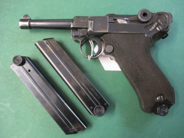 Angeboten wird eine sehr gut eraltene Pistole P 08 aus der Vorkriegsfertigung . Dazu gehören 3 Nachkriegsmagazine . Die Waffe stammt aus dem Nachlass eines Jägers der die von seinem Vater geerbt hatte , Die originalen Magazine wurde von ihm wegen schlechter Funktion seinerzeit verworfen . Die Waffe ist außer dem Riegel und dem Abzug nummerngleich , kein Neubeschuss . Brünierung original ,nur ganz wenige Fleckken , kein Rost . Lauf top . Versand ins Ausland nur über einen Exporteur.