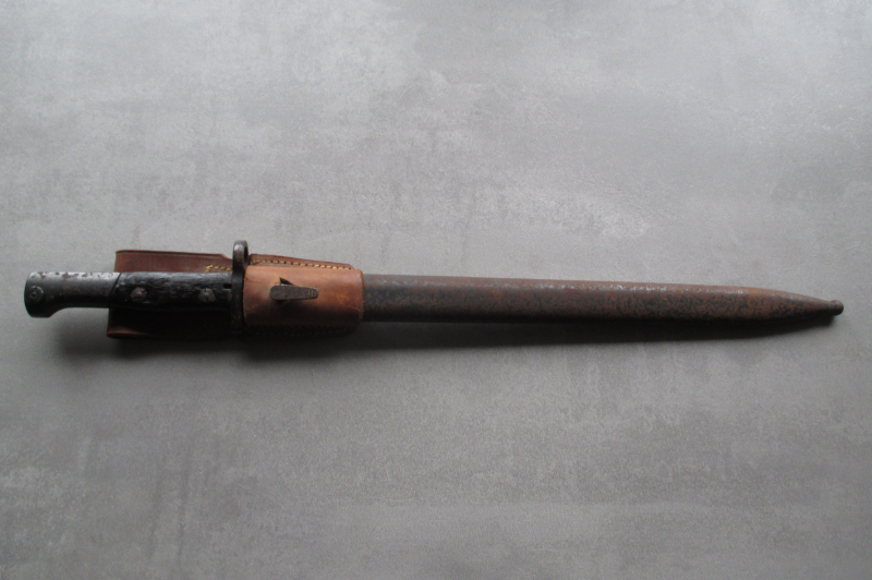 Biete hier aus Sammlungsauflösung ein schönes und originales deutsches Bajonett (lange Version) mit Lederkoppelschuh aus dem 1. WK an. Ein Stempel erkennbar am Griffkopf.