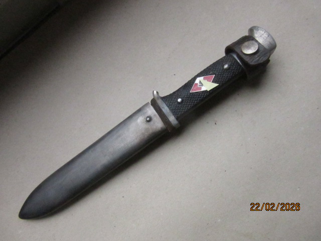 HJ-Messer original und in gutem Zustand. Ich weise auf zwei Mängel hin: 1. An der Parierstange ist der Parierhaken abgebrochen (In den Bildern 1,2,3,4 und 6 zu sehen) 2. An der Griffschale der Rückseite befindet sich eine Reparatur- Stelle (siehe Bild 3). Hersteller ist Anton Wingen in Solingen. Die Scheide ist magnetisch und hat beide Führungsfedern mit dem originalen Textilbezug so dass die Klinge weich und sauber in die Scheide geht. Die Scheide ist nicht lackiert sondern brüniert. Das Trageleder an der Scheide ist braun und für das Alter in einem sehr guten Zustand. Der Klipverschluss ist intakt. Das Emblem ist sauber eingelegt hat keinen Chip im Email und ist leicht beweglich (Wipper). Weitere Bilder gern auf Anfrage.