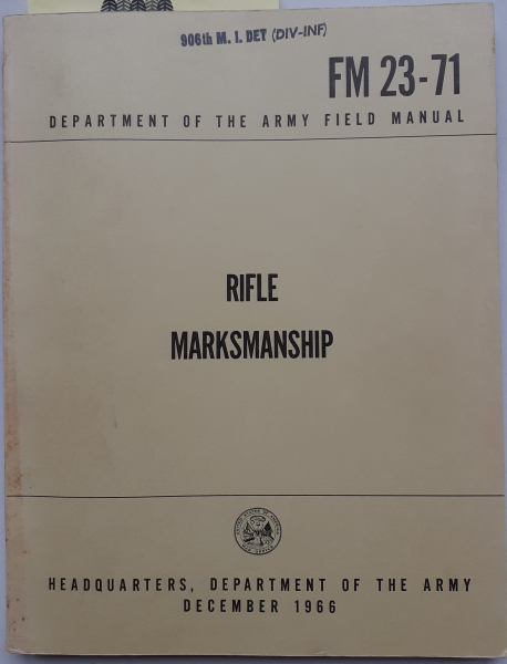Schießvorschrift "Field Manual" FM23-71 der US-Army von 1966 für Selbstladegewehr M14 Kaliber 7,62mmx51. Sehr ausführliche, originale (kein Nachdruck!) Vorschrift mit 228 Seiten, zahlreichen Fotos und Skizzen. Herausgeber: Headquarters Department of the Army, Washington, 8 December 1966. In englischer Sprache.