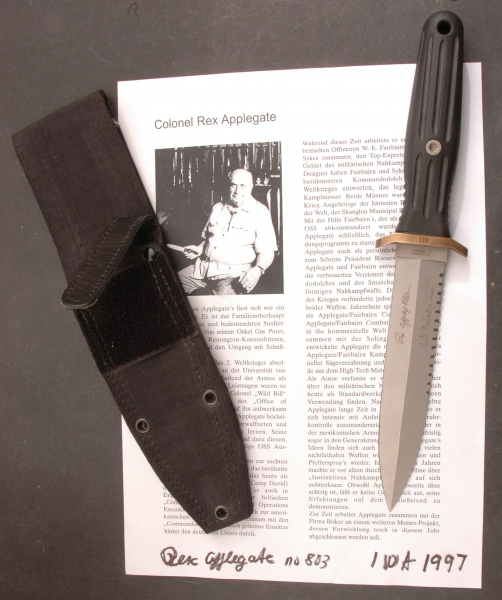 Erstausgabe von 1997 durch die Fa. Böker, auf der Beschreibung Signatur vom hoch betagten Col. Applegate, seinerzeit auf der IWA erworben wo er am Stand der Fa. Böker war, das Stück ist ungebraucht, nur leichte Anlaufspuren durch 30 Jahre Lagerung, wie abgebildet