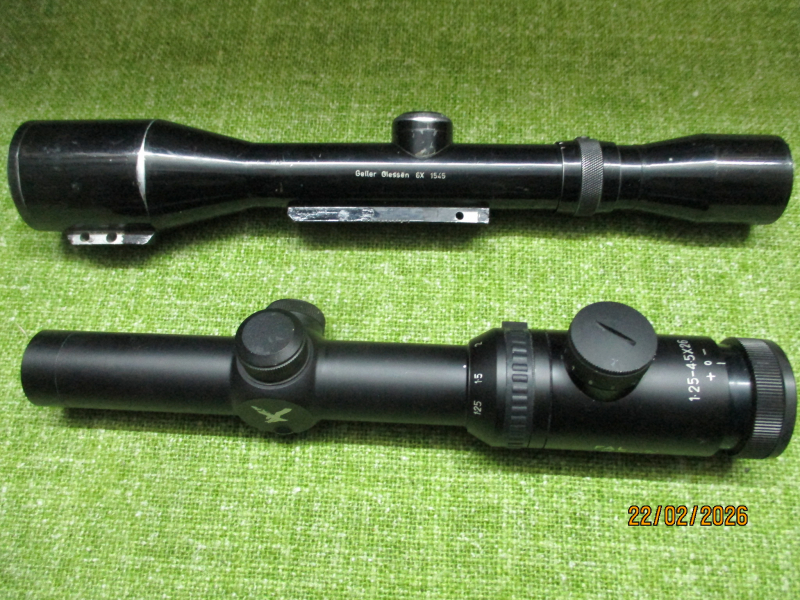 2 stück zielfernrohre : a.) falkenoptik ,absehen 4 mit mittelpunkt,dieser beleuchtbar , 1.25 x 4.5 x 26 - gute durchsicht - tubus 30 mm , für sammler o.ä. - - b.) geller ,gießen ,6-fach , absehen 1 , nr.1545 , mit schienen - durchsicht gut - für sammler o.ä.- -