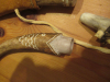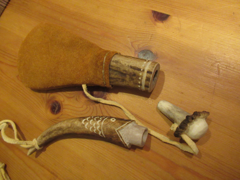 Kugelbeutel aus Leder, handgenäht, Tülle und Stopfen aus Hirschhorn gefertigt und verziert, Länge 20,5 cm, für Rundkugeln bis incl. cal.54, + superschönes oldstyle Pulvermaß aus Hirschhorn, verziert, Länge 13 cm, ca. 50 grn. Replikat des 18. Jahrhunderts ECHTE HANDARBEIT !!