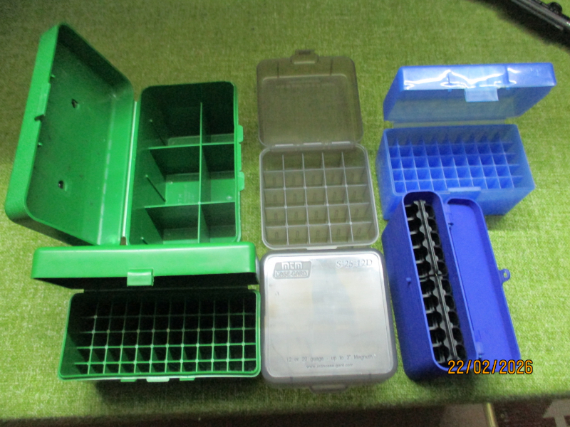 6 stück diverse minitionsboxen - - - 2 x schrotboxen dabei - die anderen für langwaffen usw. - die blaue 50er ist am griff defekt, läßt sich aber noch schließen - -