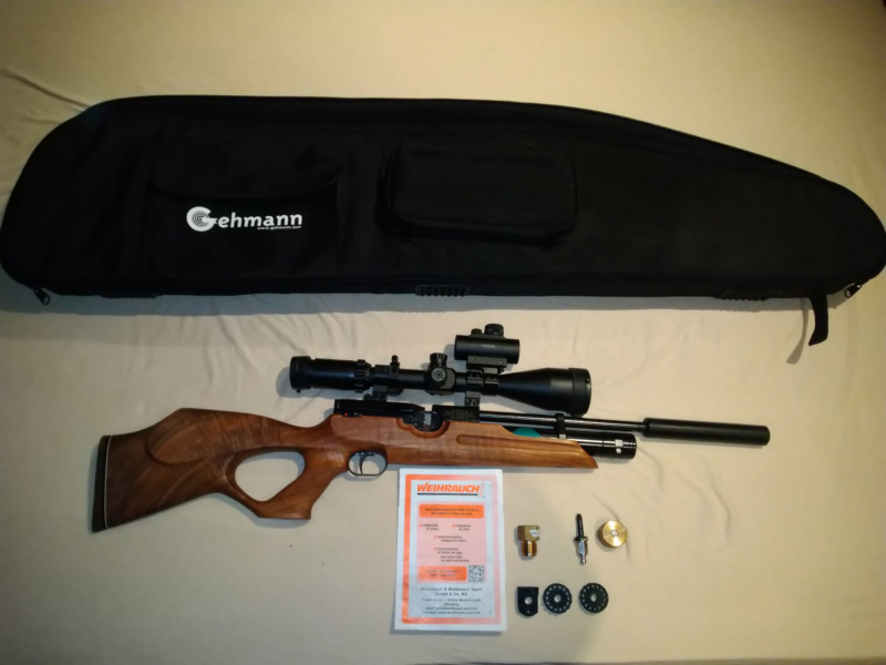 Druckluftgewehr Weihrauch HW100T mit exklusiv geöltem Nussbaumschaft, ZF Visionking 2,5-35_5x56, Reddot Hawke, Ritteroptik Angel-Indicator, 2 Magazine + 1 Einzelschussmagazin, FUTTERL Gehmann, Adapter zum Befüllen, QUICK-FILL Adapter ,Endlüftungsschraube und Bedienungsanleitung.