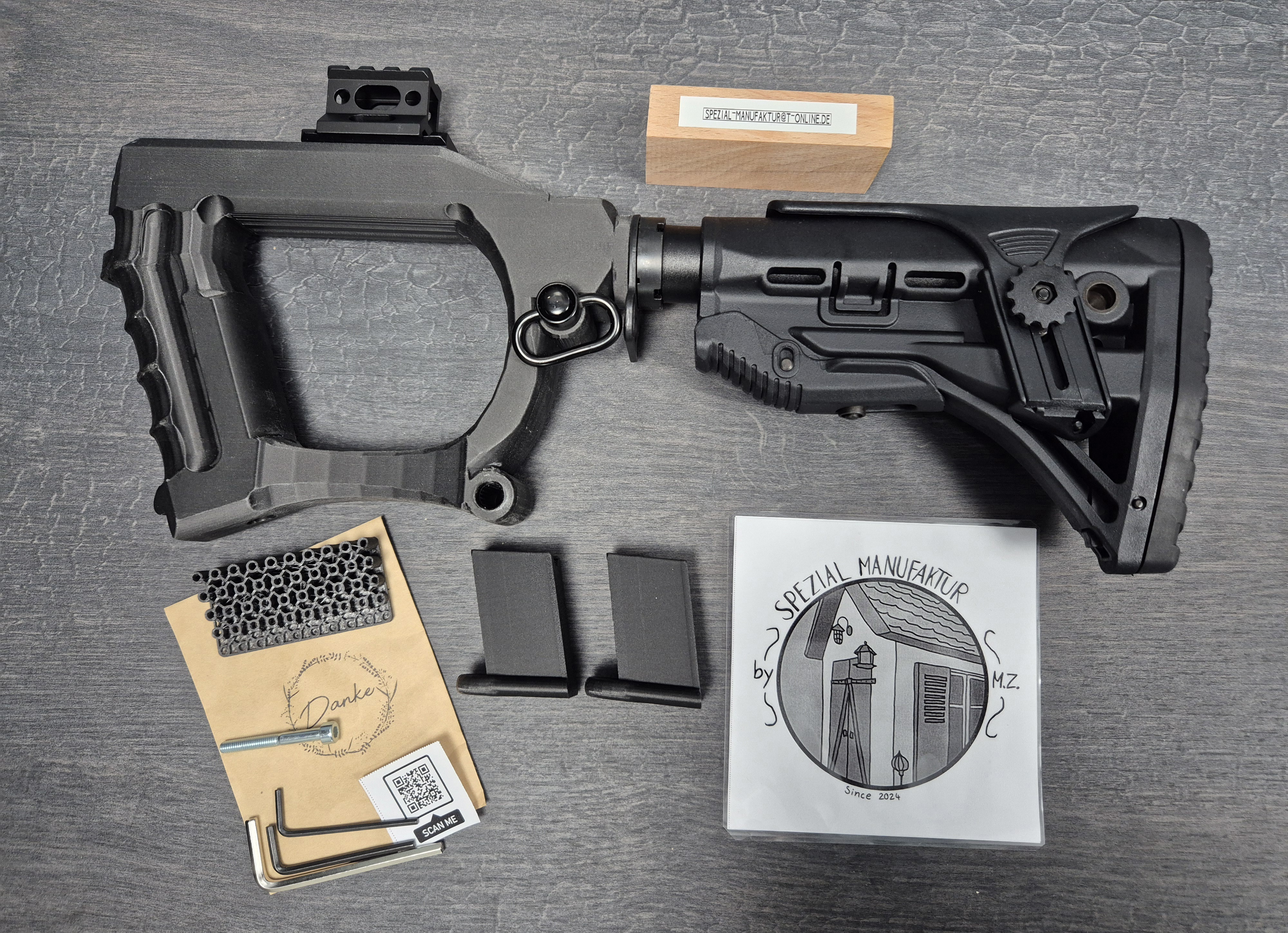 1x 3D gedrucktem Griffstück aus Carbonfaserverst. Kunststoff Inkl. taktis. Schubschaft (6 Rastpositionen-schwarz.),integr. Dämpfer und höhenvers. Kopfstütze