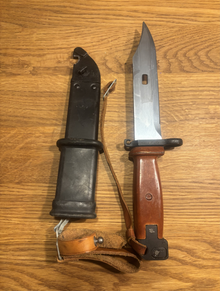 Ich verkaufe hier aus meinem Bestand / Sammlung ein gebrauchtes Russisches AK 47 Bajonet. Die Klingenlänge ist 15 cm , Gesamtlänge 27 cm . Das Messer und Scheide sind mit 0847 gestempelt. Der Zustand ist den Bildern zu entnehmen. Geliefert wird, wie auf den Fotos zu sehen.