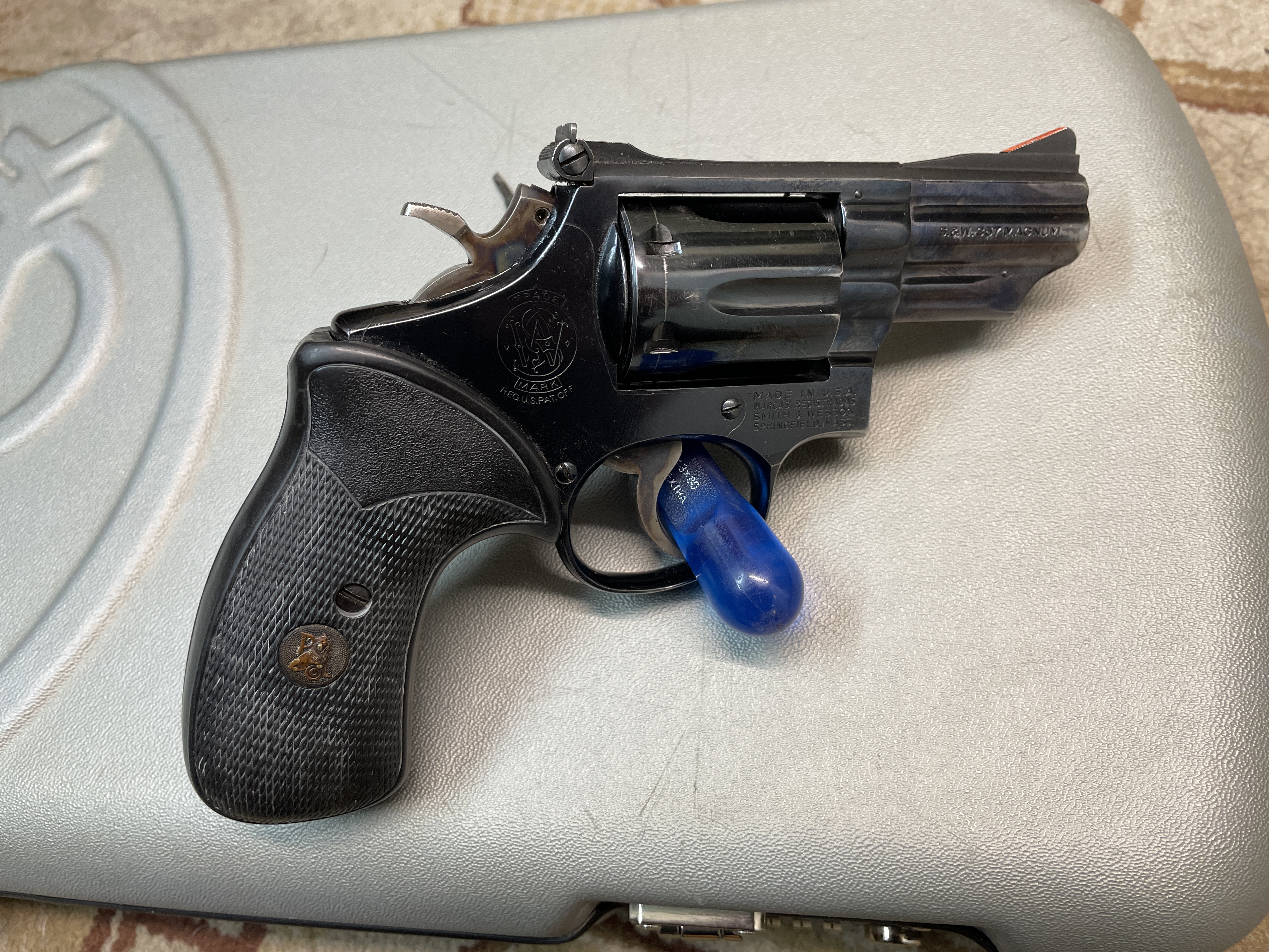 Verkaufe einen Revolver S&W im Kal. .357Mag. Modell 19-3. Beschuss `73. 2,5“ Lauf, 6-Schuss Trommel und Pachmayer Griffschalen. Hahn und Abzug bundgehärtet. Korn feststehend und das Visier ist einstellbar. Brünierung gut, Mündung leicht abgerieben. Dazu ein passendes Bianchi Paddle Holster. Verkauft wird nur gegen Vorlage einer gültigen Erwerbsberechtigung (EWB), der NWR-ID Nr. P + E, sowie einem aktuellen Voreintrag in der WBK.