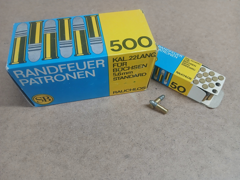 Ich biete hier aus einem Nachlass 500 Schuß Sammlermunition .22lr / .22lfb Schönebeck, aus dem VEB Spengstoffwerk Schönebeck in originaler Verpackung mit 500 Schuß originaler Umverpackung an.