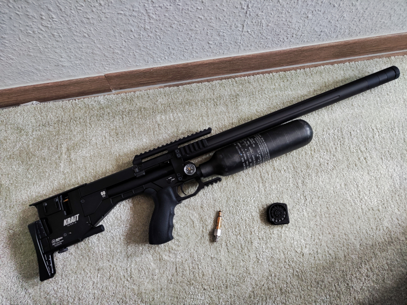 Irgendwo verliert das Gewhr Luft, man kann ganz normal damit schiesen aber wenn sie ein paar Tage steht ist sie leer, deswegen wird das Gewehr als defekt verkauft. Mit dabei ist auch noch eine 700 ml Carbon Bottle, die habe ich mir dazu gekauft aber nie benutzt.
