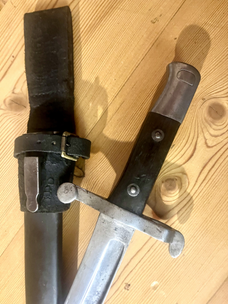 Kuk Kropatschekbajonett, Fertigung von Waffen Steyer, originaler Lederkoppelschuh mit Messingschnalle, schwarz lackierte Scheide, alles im Topzustand..