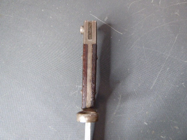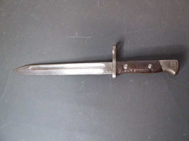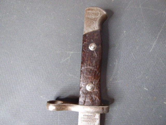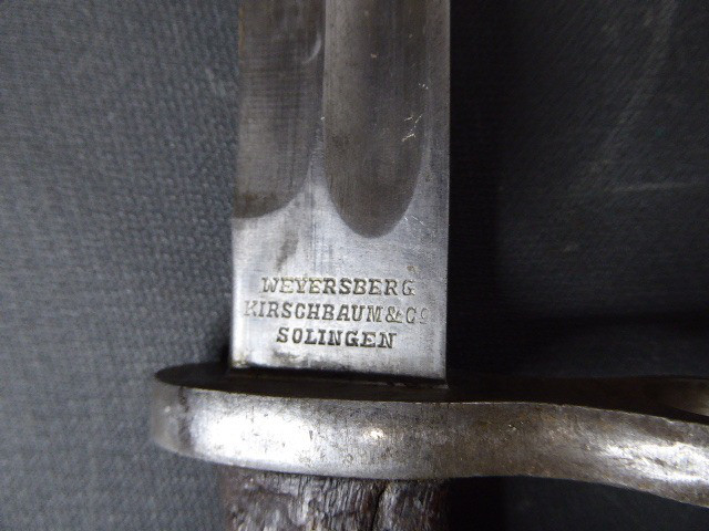 Aus meiner Sammlung gebe ich, ein altes mir unbekanntes Bajonett ohne Scheide Hersteller Weyersberg & Kirschbaum Solingen ab. Kenner werden es sicherlich wissen was das für ein Bajo ist. Griff zwei Holzschalen. Das Teil ist im Guten Sammelwürdigen Zustand. Alles andere entnehmen Sie Bitte den Fotos. Kann zu jederzeit bei mir besichtigt werden. Privatauktion keine Rücknahme und Garantie.