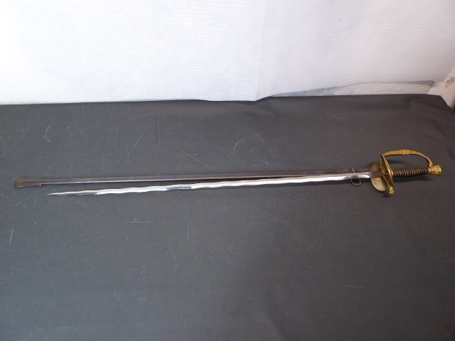 Aus meiner Sammlung gebe ich, ein alten Französischen Degen geflammte Klinge Hersteller Klingenthal und Stahlscheide ab. Keine Ahnung aus welcher Zeit. Kenner werden es sicherlich wissen aus welcher Zeit das Teil ist. Griff Horn mit Drahtwicklung. Gefäß noch zu 90% Vergoldet, einseitig zum abklappen. Geflammte Zweischneidige Klinge, einseitig mit Hersteller. Scheide Stahl mit einem, Tragering. Das Teil ist im Guten Sammelwürdigen Zustand. Alles andere entnehmen Sie Bitte den Fotos. Gesamtlänge: 104 cm, ohne Scheide: 95,5 cm, Klingenlänge: 80 cm, Klingenbreite: 1,6 cm. Kann zu jederzeit bei mir besichtigt werden. Privatauktion keine Rücknahme und Garantie.