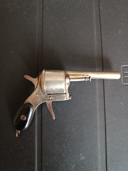Originaler Mini Revolver aus vernickelten Metall ,läßt sich spannen und abschlagen.Vermutlich um 1880 gefertigt.Keinerlei Stempel oder Markierungen.Zweck unbekannt.Zustand siehe Bilder.Länge ca.100 mm.