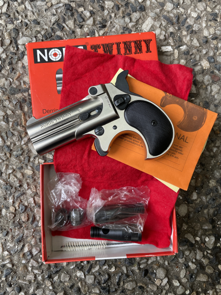 TOP Noris Twinny Derringer in Nickel 9mm Knall. Zubehör ist alles vorhanden wie auf dem Bild. Originale Box und Papiere, PTB550, neuwertig !!! siehe Bilder