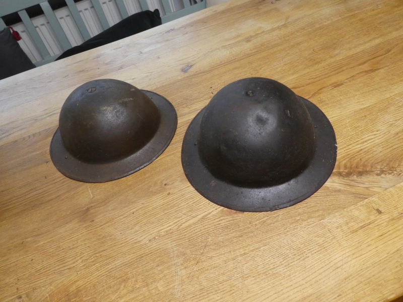2 englische Tellerhelme, auch Brodie Helme genannt. Einer hat noch mehr Farbe als der andere. Einer mit, einer ohne Kinnriemen.