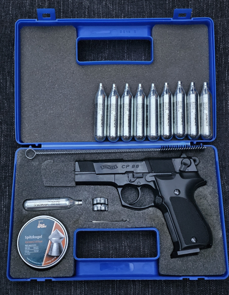 Waffe wird mit original Koffer, zwei Magazine, Diabolos, Beschreibung und 9x Co2 Patronen verkauft.