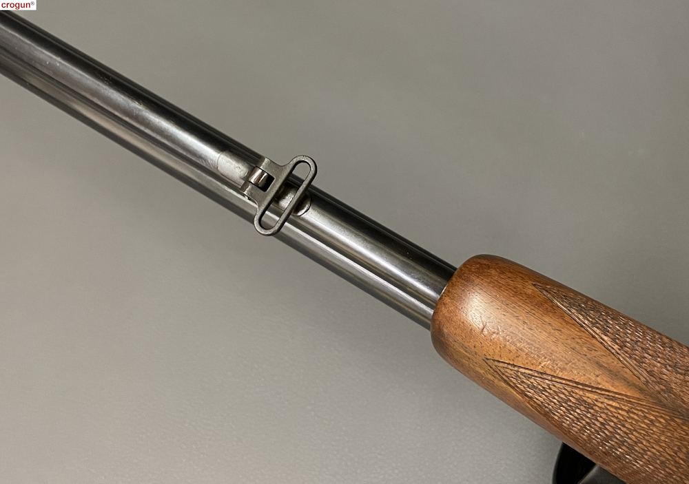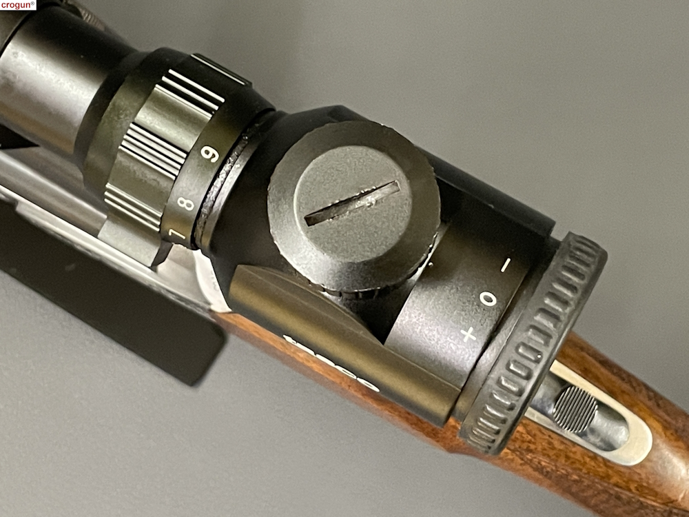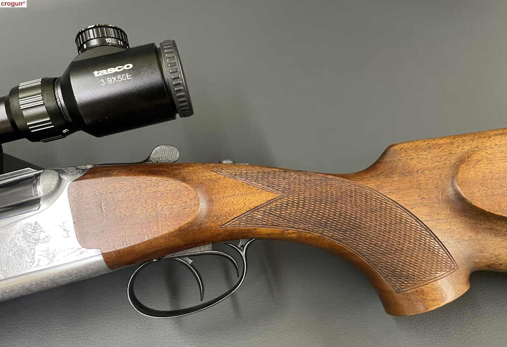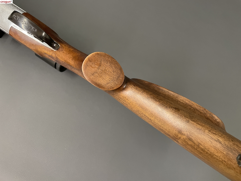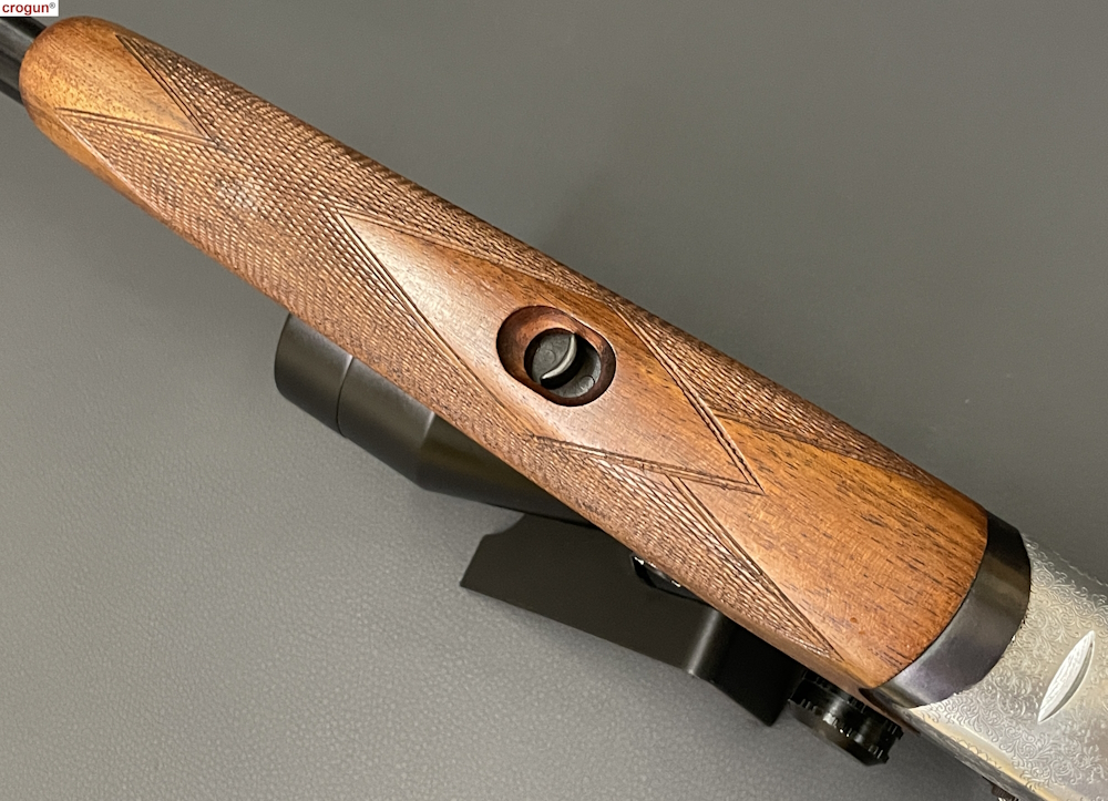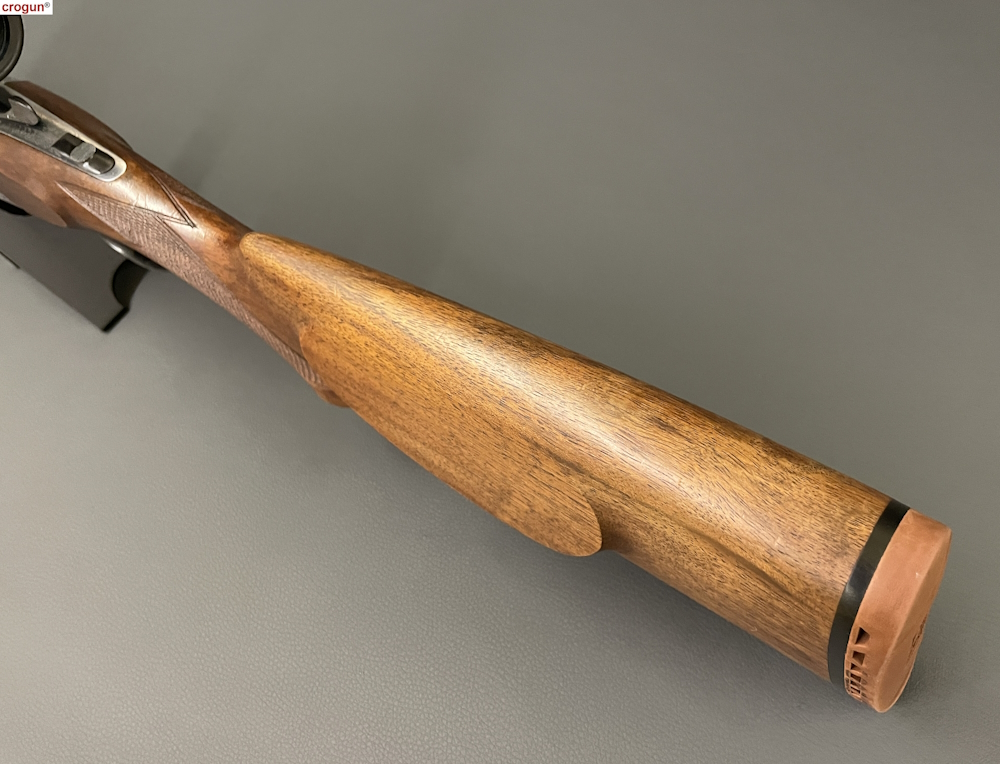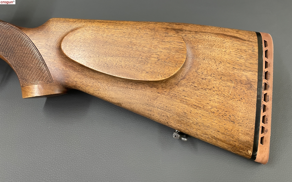 Schaft: Nussbaum mit Pistolengriff und Backe, partielle Fischhaut, Riemenbügel und Kunststoff-Schaftkappe