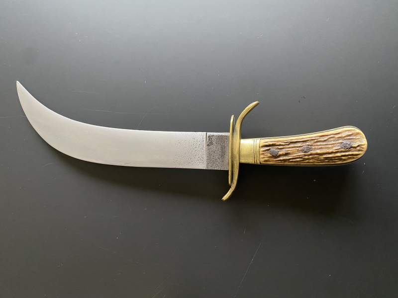 Ein äußerst seltenes und historisch bedeutendes gebogenes Jagdmesser, zugeschrieben Gustav Laute, Hoflieferant in Berlin im späten 19. und frühen 20. Jahrhundert. Laute belieferte Angehörige des Adels, kaiserliche Offiziere sowie Mitglieder des Hofes mit hochwertigen Blankwaffen und Jagdutensilien. Originale Stücke sind heute außerordentlich selten.
