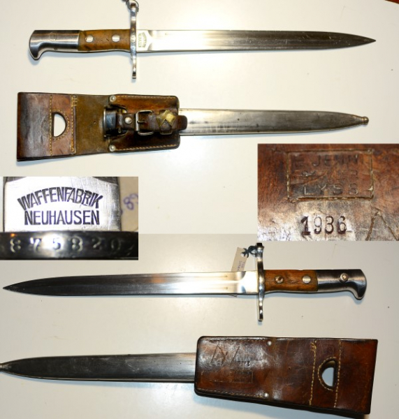 Schweizer Dolchbajonett Modell 1889 für Schmidt-Rubin Gewehr M89, Klingenlänge 30cm, Hersteller "Waffenfabrik Neuhausen", mit Koppelschuh, dieser gestempelt 1936, guter Zustand mit Gebrauchsspuren