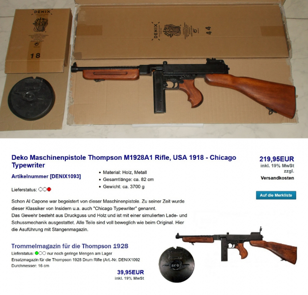 Thompson M1928A1 Rifle Denix mit Stangen + Trommelmagazin für 170 €