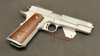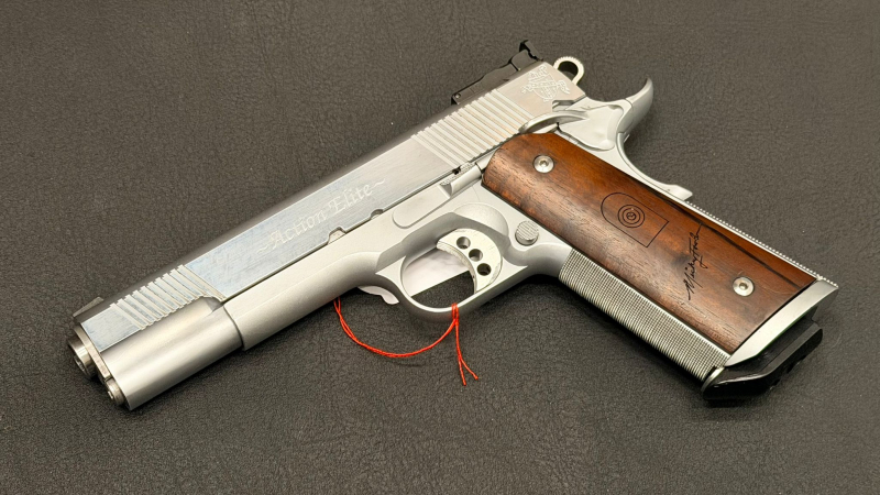 Diese Pistole verbindet klassische 1911-Ästhetik mit sportlicher Präzision. Die hochwertige Oberfläche, die gravierte „Nowlin“-Signatur auf dem Verschluss sowie die edlen Holzgriffschalen mit „Mickey Fowler“-Signatur verleihen ihr eine besonders stilvolle und zugleich sportliche Erscheinung.