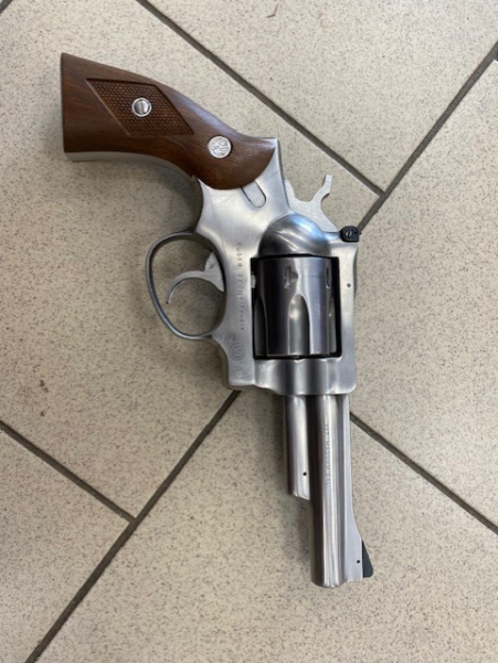 Achtung, gepflegter stainless Revolver Ruger Security-Six im Kaliber .357 Magnum. 4" Lauflänge und 6 schüssige Trommel. Griffschalen aus Holz mit Ruger Logo. Die Waffe ist technisch und optisch in einwandfreiem Zustand. Korn ist austauschbar.
