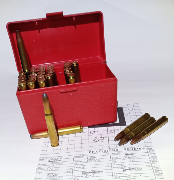 In einem Jägernachlaß befand sich unter anderer 9,3 x 62 Munition die abgelichtete Munitionsbox mit insgesamt 31 Patronen.