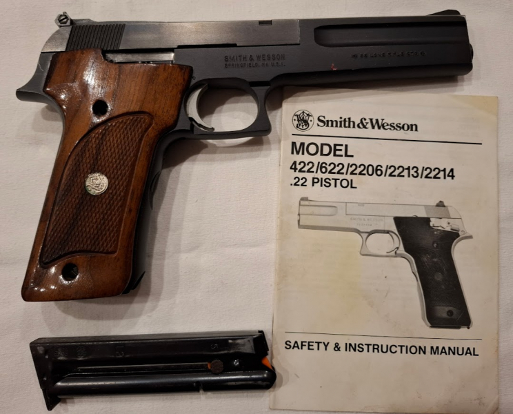 Smith & Wesson, S&W, Modell 422, Model 422, 422, .22lr, .22 l.r., .22lfB, Kleinkaliberpistole, KK Pistole, Selbstladepistole, Sportpistole, Matchpistole, 6 Zoll, 6", Mikrometervisier, Target Sight, Holzgriff, Holzgriffschalen, Sammler, Klassiker, US Pistole, Springfield MA, Koffer, Anleitung, Magazin