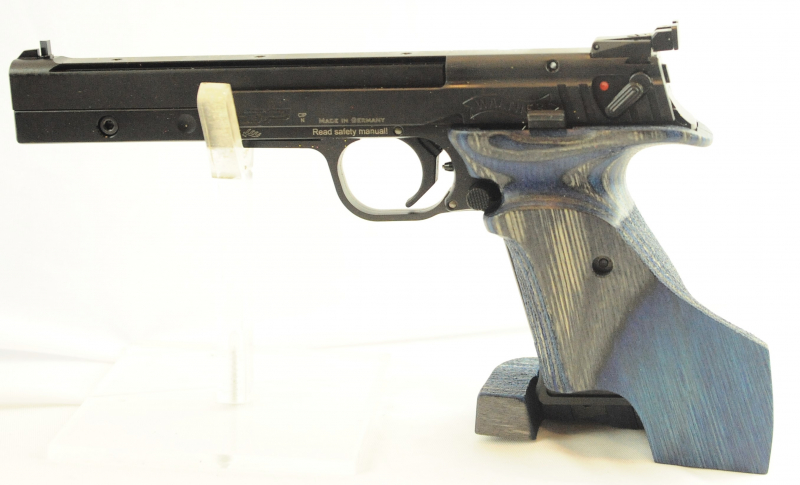 Anatomischer Wettkampfgriff aus engelsblauem Schichtholz (Standard) oder kaukasischem Nussbaum (optional)