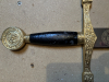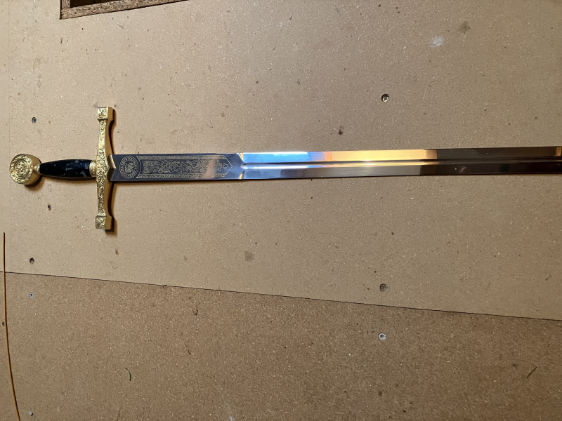 Excalibur Replika - das Schwert von König Artus. 420er rostfreiem, gehärtetem Staat. Seidenmatt poliert. Klinge mit feiner Ätzung und keltischen Ornamenten. Schwarzer Griff ebenfalls mit Ornamenten versehen. Zustand siehe Fotos.