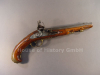 Steinschlosspistole um 1800, verzierte Messing Beschläge, schönes Schloß und Lauf aus Eisen, Lauf mit teils vergoldeten Verzierungen, Schloß mit Signatur des Büchsenmacher "T.MINICK" (Toussant Mathias Minick, Liege Belgien 1781-1803), geschnitzter Holzschaft, mytischem Gesicht aus Messing am Ende des Griffes, ohne Ladestock, Schloß, Hahn und Abzug voll funktionsfähig, Holzschaft im vorderen linksseitig Bereich mit zwei Rissen, unter dem Schloß im Holz mit eingeschlagener Zahl "6", Kaliber ca.14,5 mm, gesamte Länge ca.35 cm, sehr schöne Steinschloßpistole in gutem Zustand