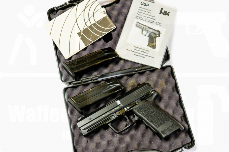 Es handelt sich bei diesem Angebot um die abgebildete Pistole Heckler & Koch Modell USP im Kaliber .45 Auto. Die Pistole stammt aus erster Hand und ist in gutem Gebrauchtzustand. Die tatsächlich geleistete Schusszahl ist überschaubar. Der Lauf ist blank. Der Lieferumfang ist komplett und umfasst den Koffer, Pistole, 2 Magazine, Anleitung sowie das Anschuss-Zertifikat.