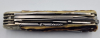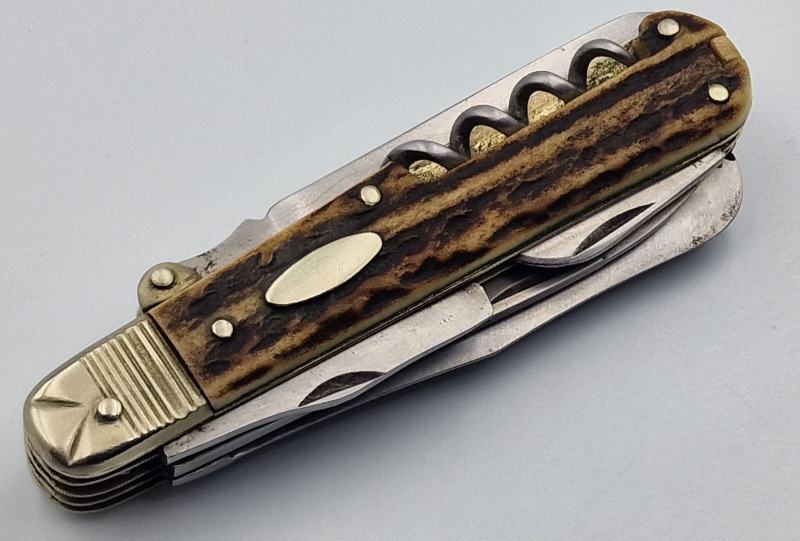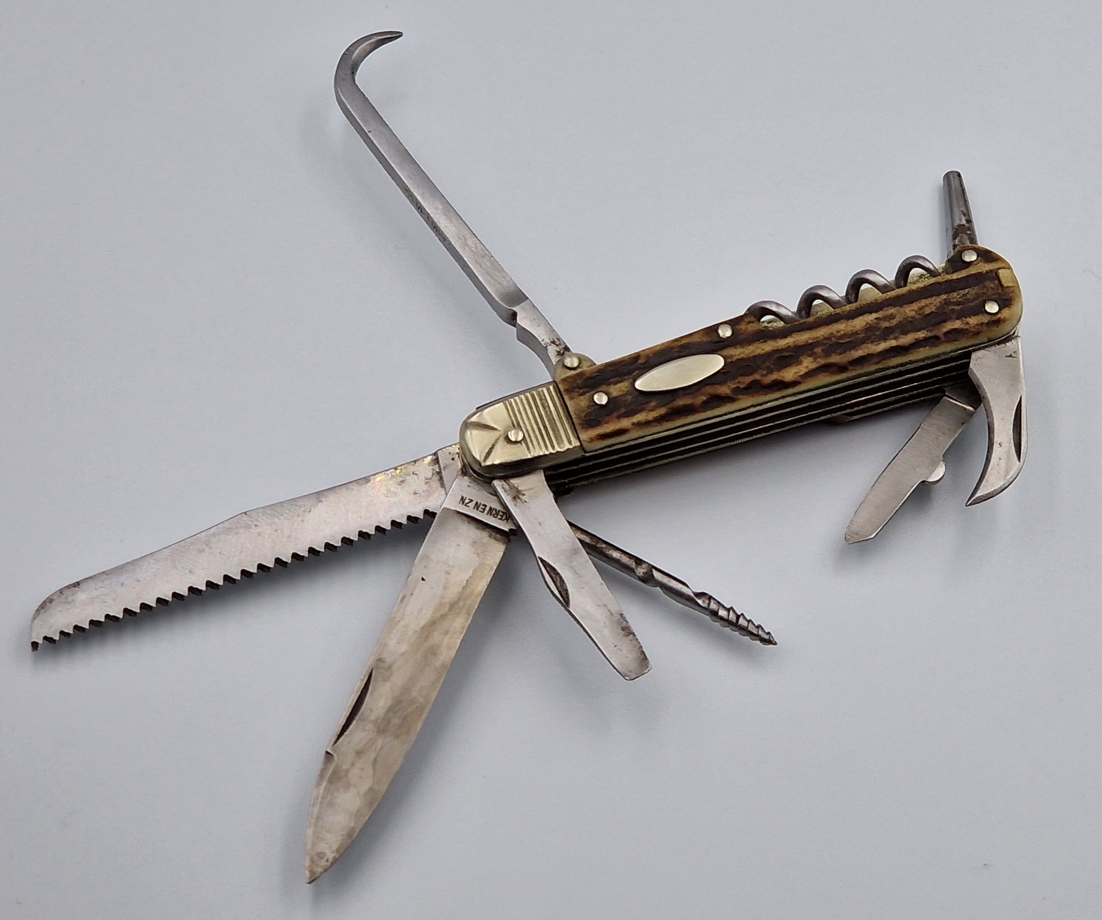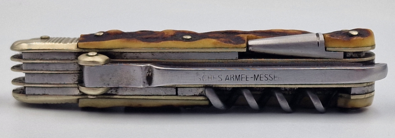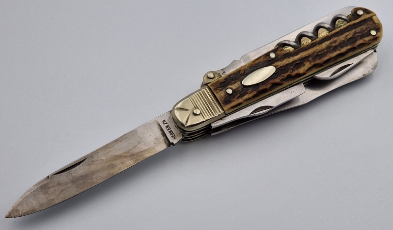 Hauptklinge und Federklinge, Korkenzieher, Schraubenzieher, Säge, Hufkratzer mit Feuerschläger/ Reibe, Dosenöffner, Pfriem und Feuersteinspender.