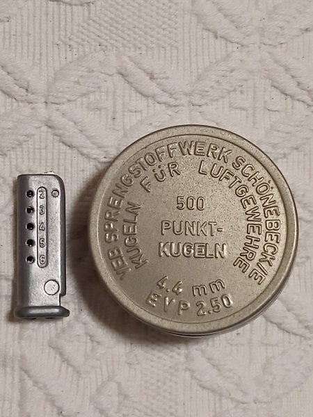 Weiterhin ist dabei eine Schachtel mit ca. 500 Bleikugeln 4,4 mm für dieses Magazin.