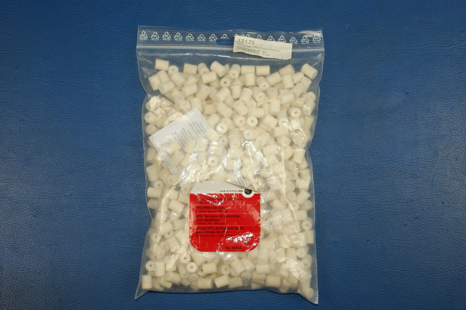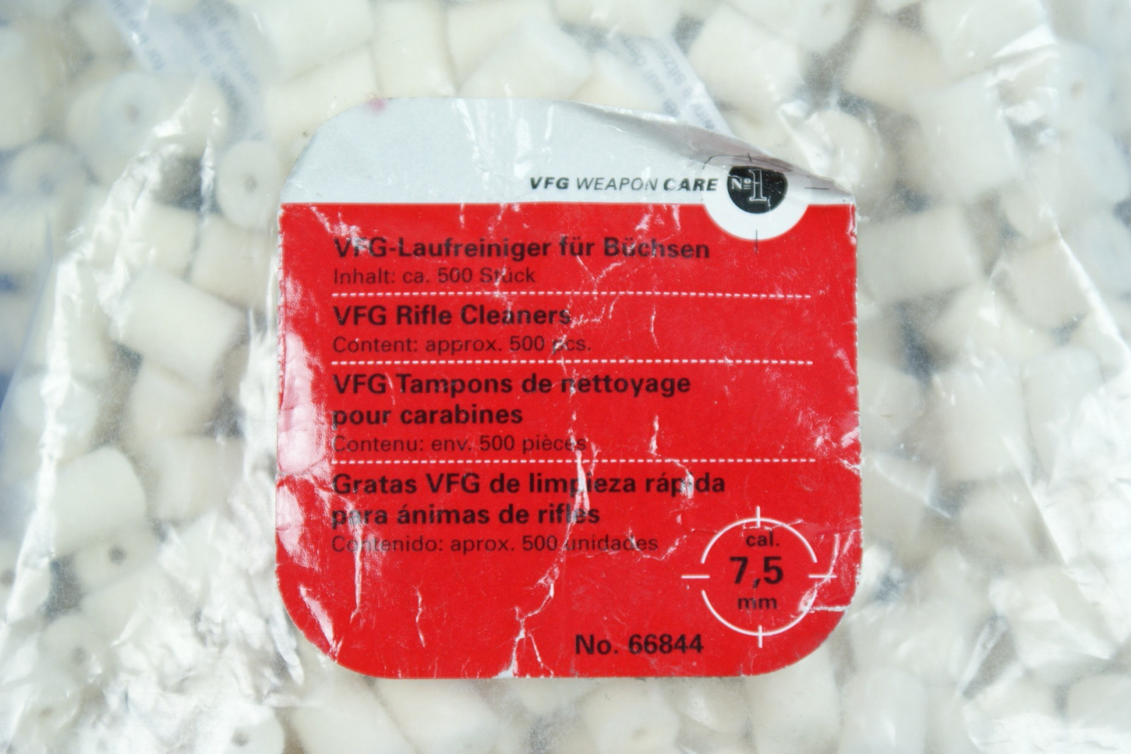 Ungeöffnete Tüte mit VFG-Laufreiniger für das Kaliber 7,5mm. Filz Reinigungs-Pfropfen.