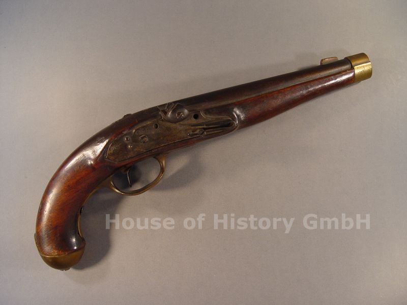 Perkussionspistole der Kavallerie Modell 1823/50 (Steinschloß auf Perkussion aptiert) wohl der Gewehrfabrik Spandau Potzdam, Schloß und Lauf aus Eisen, alle anderen Metallteile aus Messing, keine erkennbare Signatur, schlichter Holzschaft, Hahn und Hahnsicherungsbügel fehlen, Abzug ohne Funktion, diverse teils schwer erkennbare Abnahme und Nummernstempelung auf den Metallteilen, Kaliber ca.16 mm, gesamte Länge ca.39,5 cm, gutes Restaurationsobjekt mit solider Grundlage dieser seltenen Kavalleriepistole