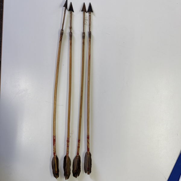 Ein Set aus vier (4) originalen, handgefertigten Jagdpfeilen der Maasai (Ostafrika). Diese Stücke sind hervorragende Beispiele für traditionelle afrikanische Schmiede- und Bogenbaukunst.