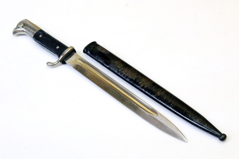 Das Seitengewehr sehr gut erhalten. Die Scheide mit Altersspuren. Lackverlust, wohl durch Entfernen von Korrosion.