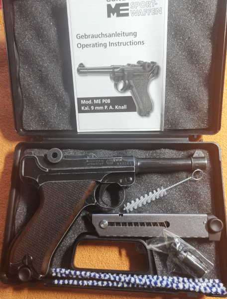 Da ich meine Sammlung reduzieren will, biete ich diese Luger 08 von Melcher im cal. 9mm P.A.K. im "antiklook" an: die Waffe wurde vom Hersteller so vorgefertigt, um ein realistisches Design des Weltkrieg I & II widerzuspiegeln! Sowohl von mir wie vom Vorbesitzer nie abgefeuert,- also ein reines Sammlerstück, welches mit einem ebenso neuem Holster der Firma EDS aus echtem Leder geliefert wird! Ebenso werden mitgegeben: die Aufbewahrungsbox, Gebrauchsanleitung, ein neues Ersatzmagazin, Putzbürste, Zusatzlauf für Pyromunition und nicht zuletzt die Originalrechnung von 2024 des Vorbesitzers! Aufgrund der Kniegelenkmechanik ist diese Pistole eher langsamer als die heutigen abzufeuern am Silvesterabend! Material: Zinkdruckguss/Metall, Gewicht: 874g, Holzgriffschalen mit Fischhautmuster wegen der besseren Griffigkeit! Da von privat angeboten, gibt es keine Rücknahme oder sonstige Gewährleistungen! Nur Trockentest durchgeführt!