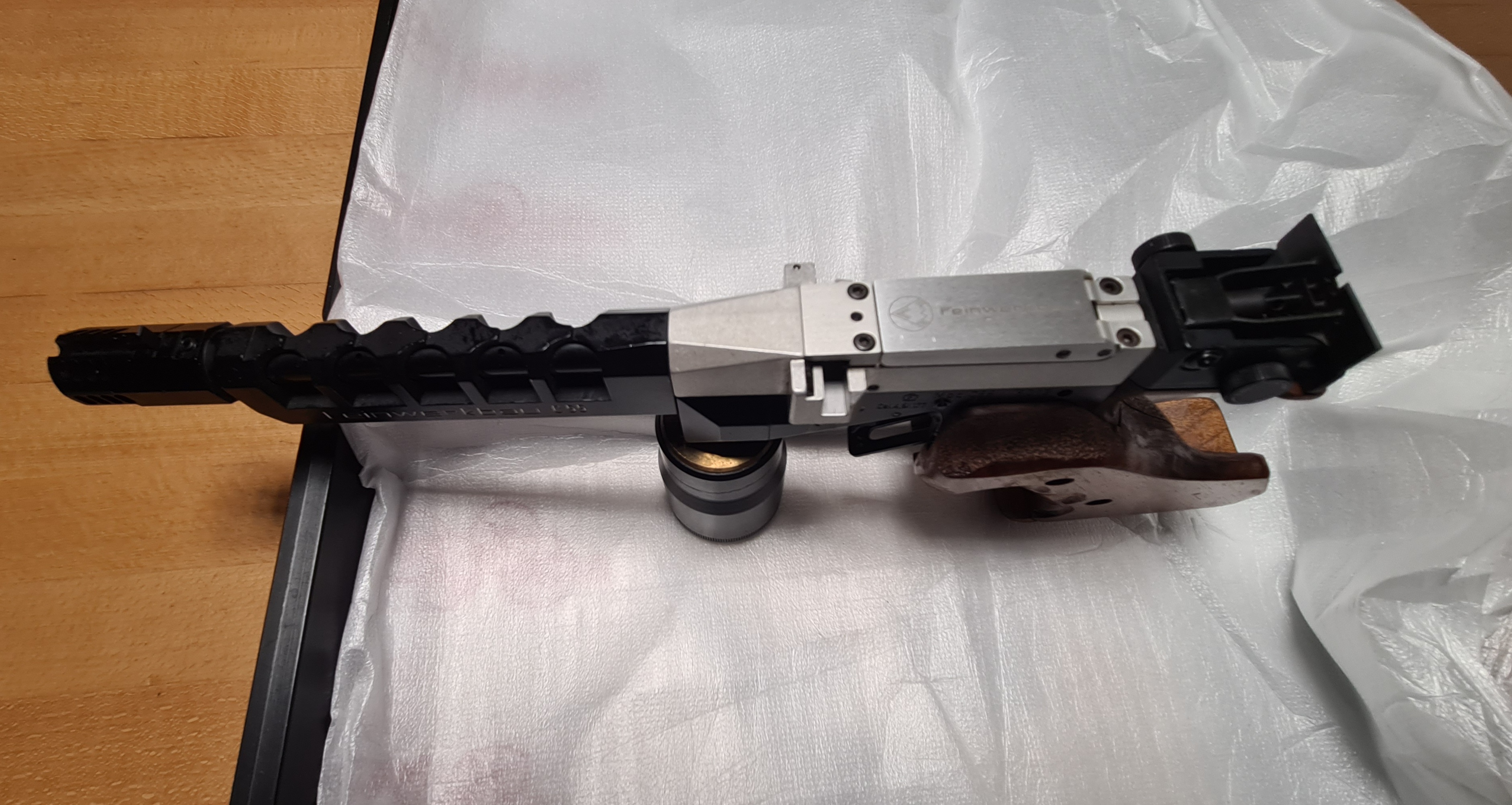 Biete für einen älteren Schützenkollegen eine schöne 5 schüssige Feinwerkbau C55 an. Sie ist in einem sehr guten Zustand und funktioniert einwandfrei. Sie wird mit CO2 betrieben, mit dem Behälter an der Waffe konnte ich 8 Schuß abgeben obwohl die Pistole schon ca 10 Jahre nicht mehr benutzt wurde. TüV von den Kartuschen ist denke ich abgelaufen, finde aber kein Datum. Es sind 3 Stangenmagazine für 5 Diabolos, eine zweite Kartusche, ein Koffer mit Schlüssel und die nummerngleiche Bedienungsanleitung. Keine Garantie und keine Rücknahme, Altersnachweis erforderlich, kein Versand ins Ausland.