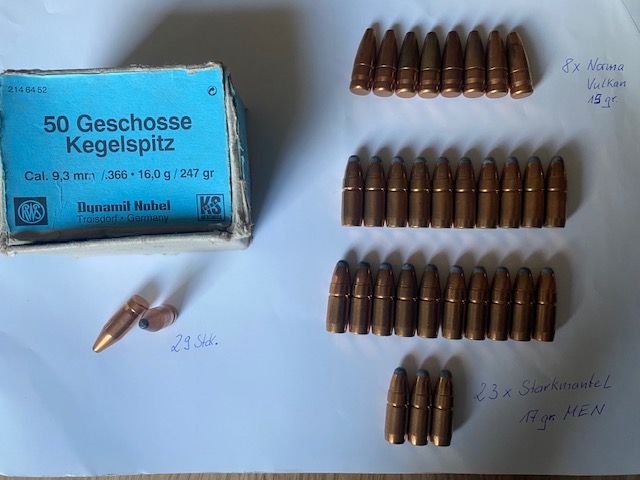 Biete hier verschiedene Geschosse im Kaliber 9,3 mm . Im Einzelnen 29 Stck. Kegelspitz 16 g von RWS, 23 Stck. Starkmantel 17 g von MEN und