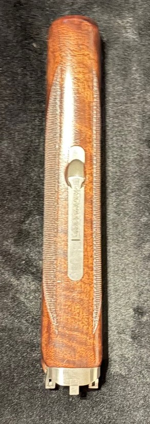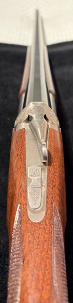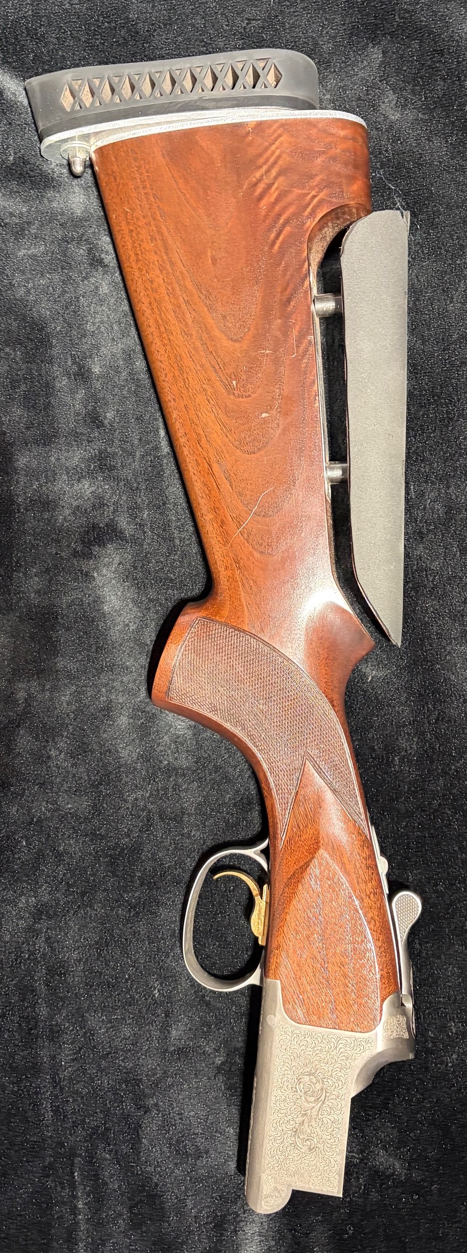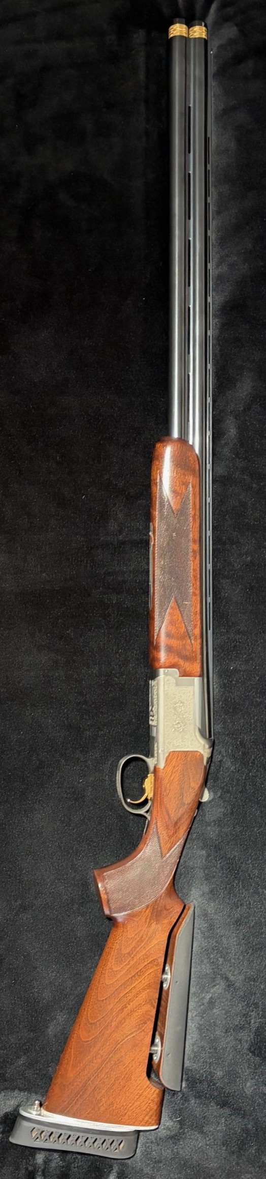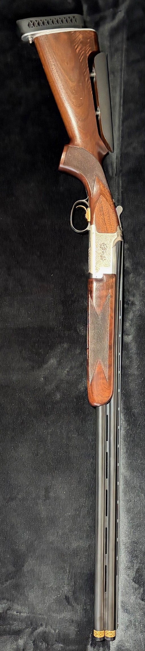 Die Läufe sind spiegelblank. Der Verschluss ist dicht und satt – der Verschlusshebel steht noch ganz rechts. Mit dieser Waffe wurden max. 500 Schuss abgegeben. Ich hatte diese für meine Tochter erworben, die sich aber andere Prioritäten gesetzt hat. Diese Bockdoppelflinte bekam nachträglich noch einen verstellbaren Schaft. Der Schaft weist rechts ein paar dünne Ratzer auf. Diese sind rein optischer Natur und beeinträchtigen weder Funktion noch Präzision. Insgesamt eine technisch überzeugende Wettkampfflinte. Sie kann aber ohne weiteres, auch aufgrund ihrer Leichtigkeit, im Revier geführt werden!