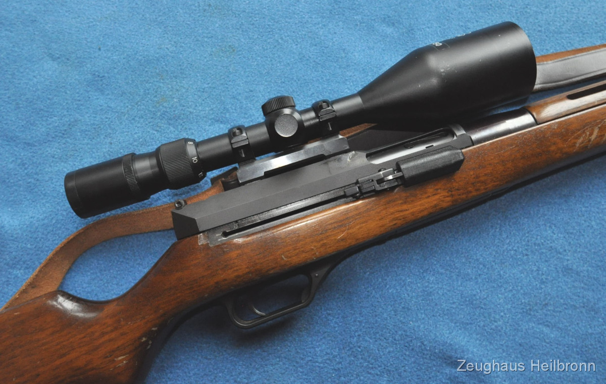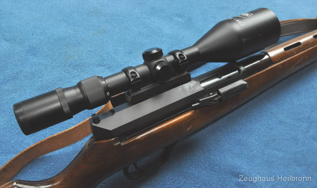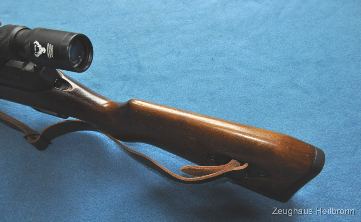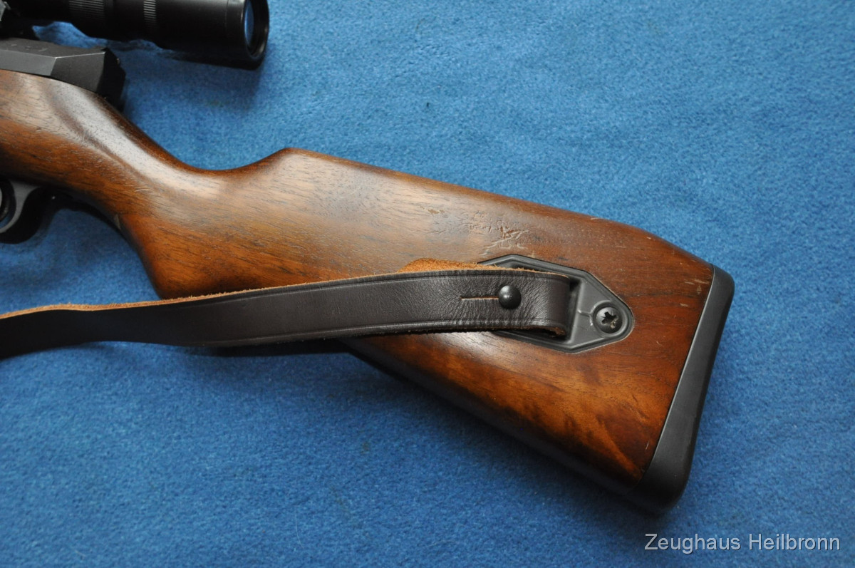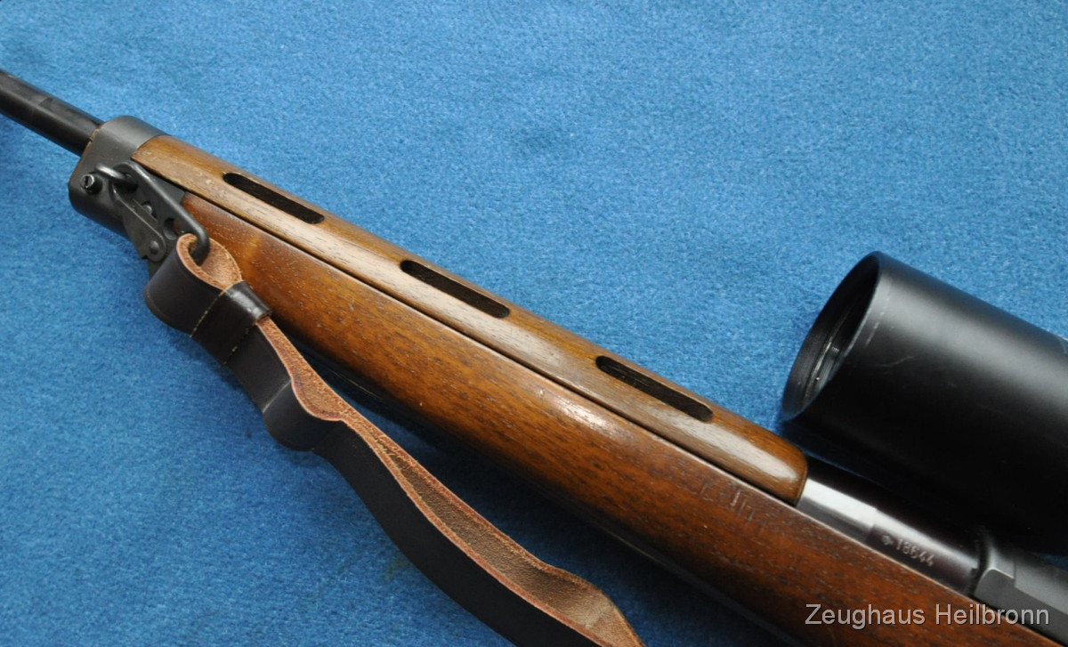 Waffe aus Jägerbestand mit leichten, jagdtypischen Gebrauchsspuren am Schaft. Lauf blank, volle Funktion. In Deutschland seltene Exportausführung mit geschlitzen Handschutz und Mündungsfeuerdämpfer (abschraubbar). 3 Schuss Magazin. Kimme fehlt. ZF mit H&K Spannmontage, Seeadler 4-12x56 Abs. 4