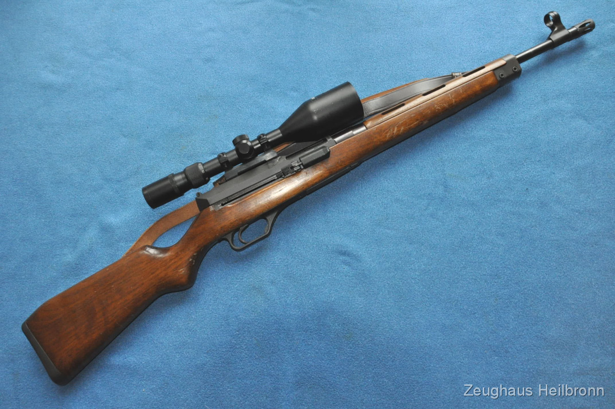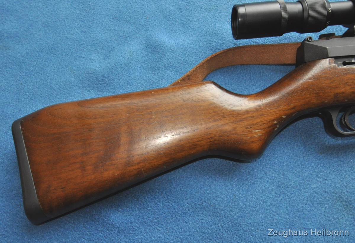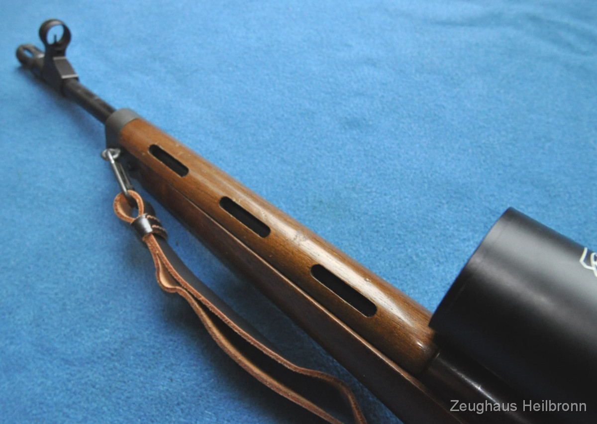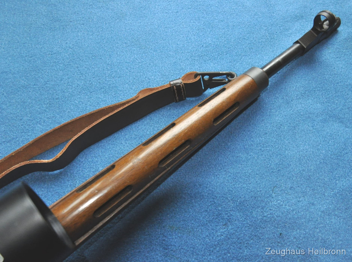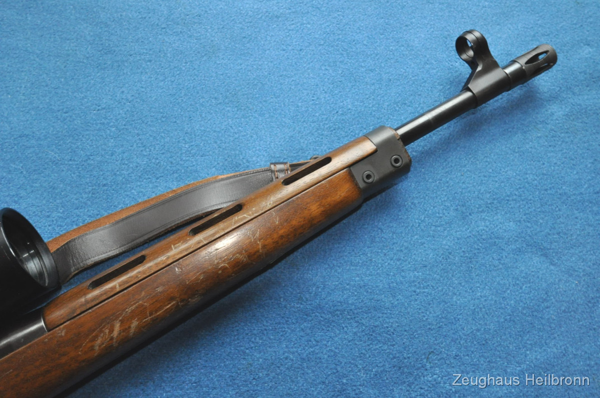 Waffe aus Jägerbestand mit leichten, jagdtypischen Gebrauchsspuren am Schaft. Lauf blank, volle Funktion. In Deutschland seltene Exportausführung mit geschlitzen Handschutz und Mündungsfeuerdämpfer (abschraubbar). 3 Schuss Magazin. Kimme fehlt. ZF mit H&K Spannmontage, Seeadler 4-12x56 Abs. 4