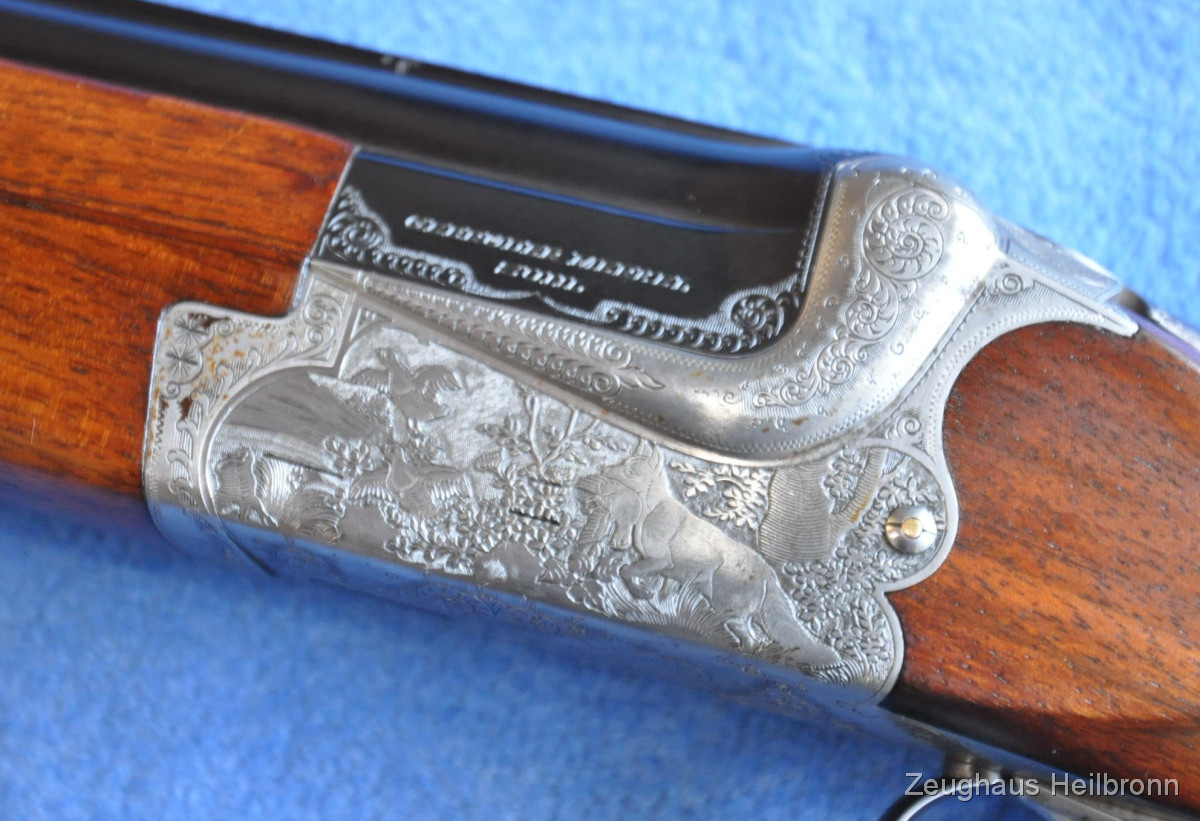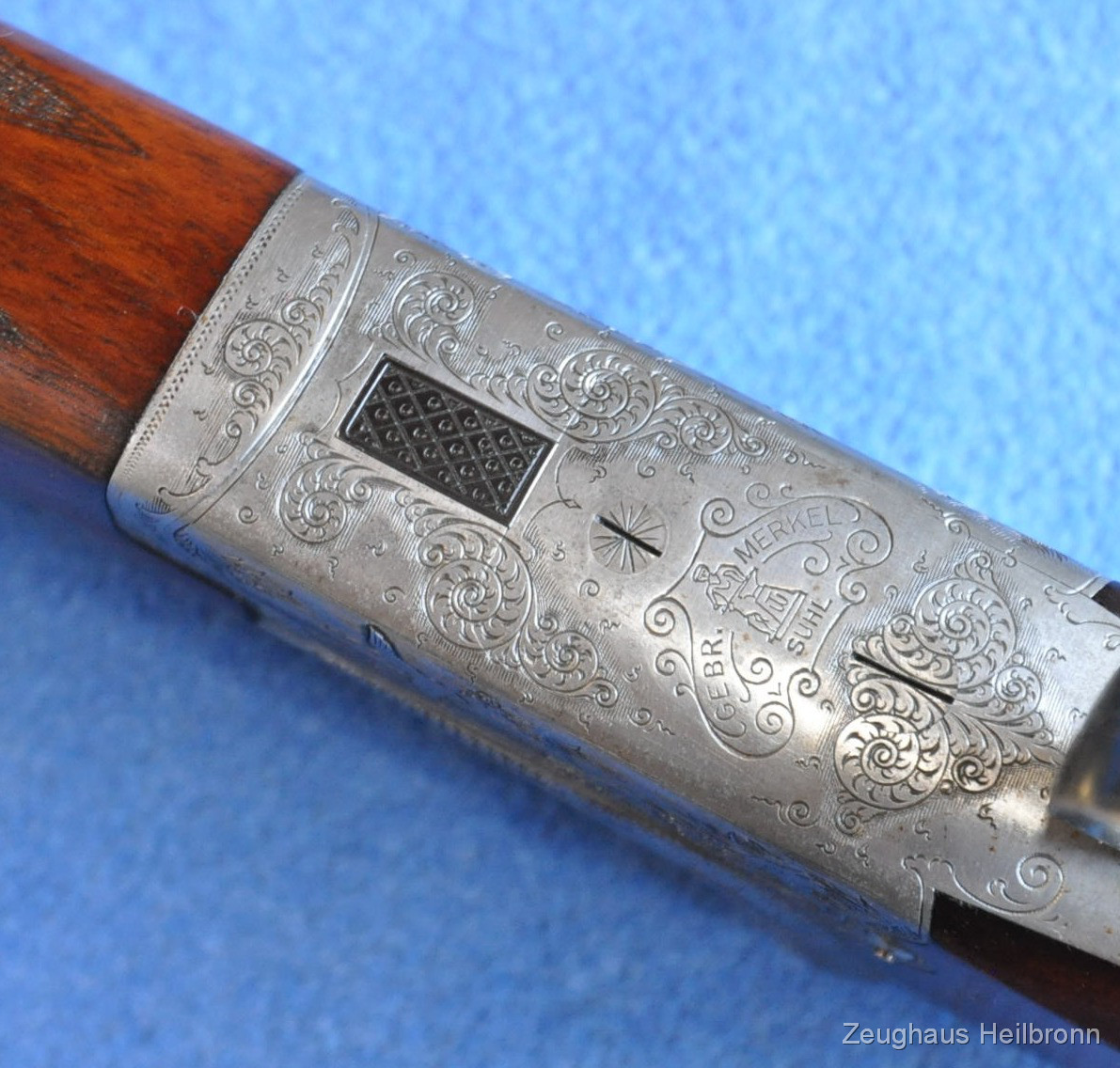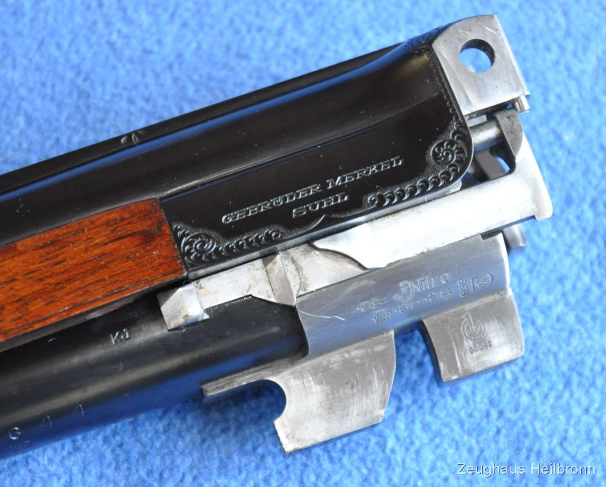 Hochwertige Bockflinte von Merkel Suhl - noch echte Büchsenmacherarbeit. Waffe in einem sehr schönen Zustand mit leichten Gebrauchsspuren am Schaftholz, siehe Bilder, System dicht, Läufe blank. Basküle mit tief Gravierten Tierstücken, Signalstifte, Ejector.