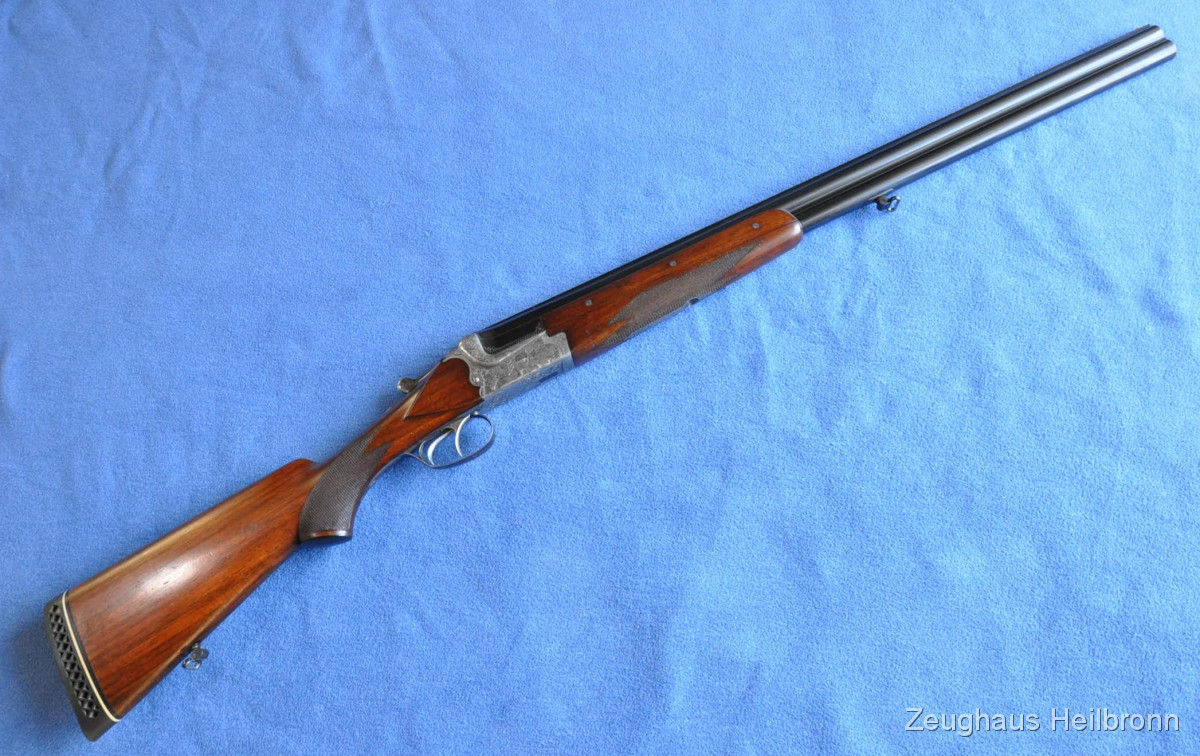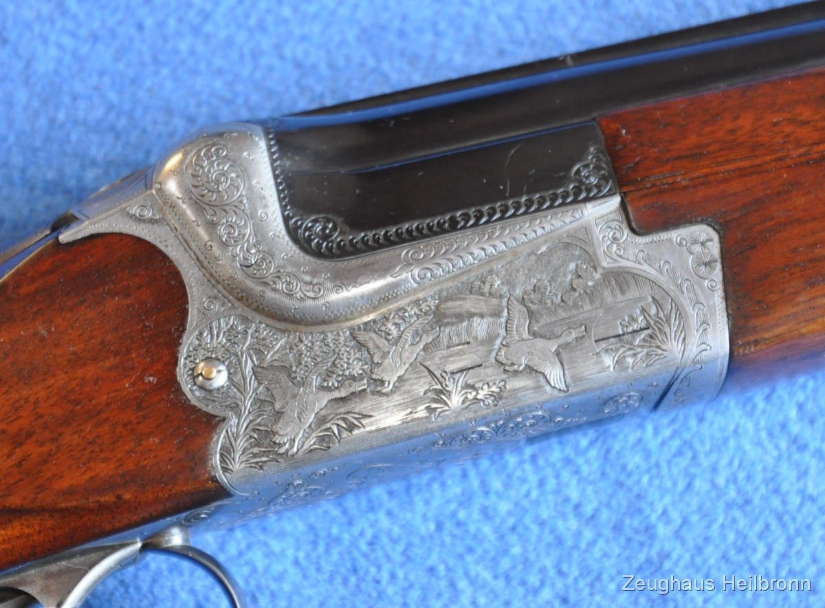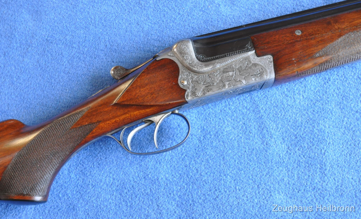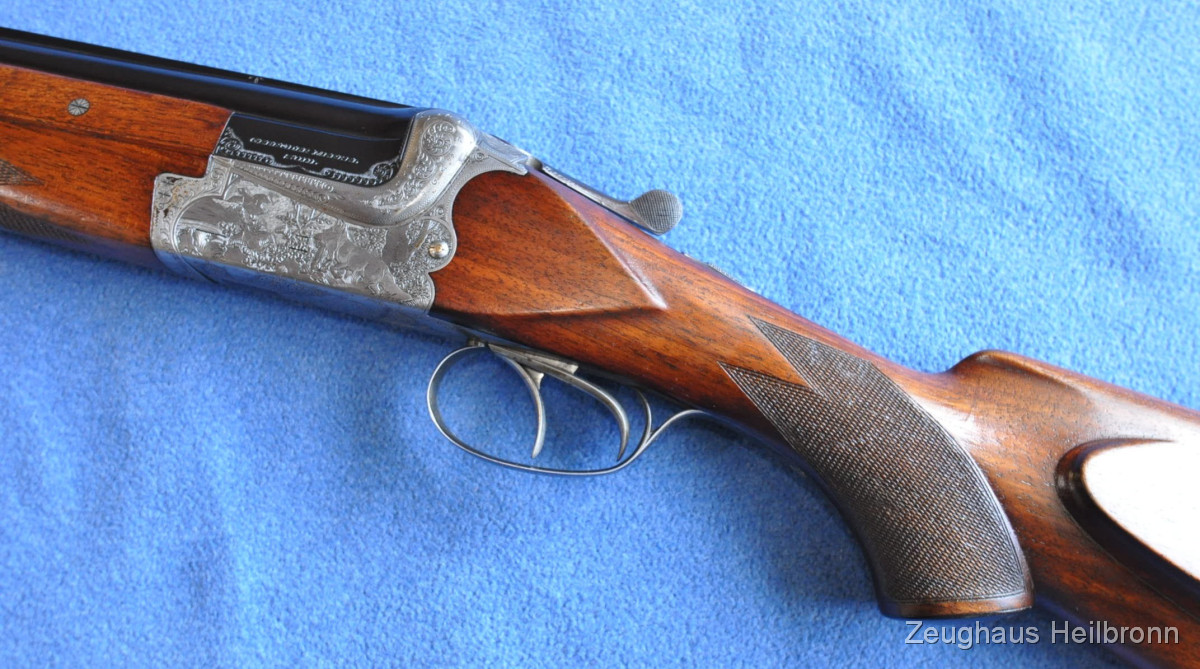 Hochwertige Bockflinte von Merkel Suhl - noch echte Büchsenmacherarbeit. Waffe in einem sehr schönen Zustand mit leichten Gebrauchsspuren am Schaftholz, siehe Bilder, System dicht, Läufe blank. Basküle mit tief Gravierten Tierstücken, Signalstifte, Ejector.