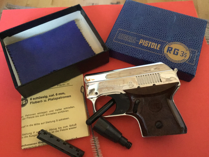 Der RG 3s ist ein absoluter Klassiker und sehr sehr selten.Die verchromte Oberfläche und ihre Kompaktheit verleihen der Pistole ein markantes, unverwechselbares Aussehen. Das 6-schüssige Stangenmagazin transportiert die Patronen nach jedem Schuss mechanisch weiter.