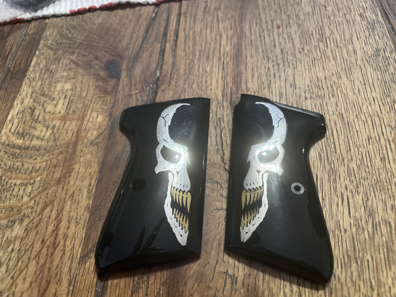 Totenkopfgriffschalen für Walther PP, scharfe Waffe. Kunststoff mit silberfarbenen Metalleinlage als Totenkopf.