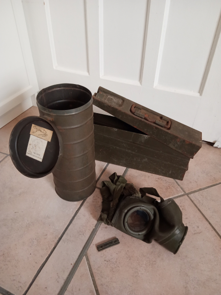 Kein internationaler Versand / no international shipping! Versand nur innerhalb Deutschland / shipping only in germany! *** Ich verkaufe hier einen WK II Schutzmaskenbehälter aus Blech. Der Behälter ist unrestauriert in Originalfarbe mit leichem Rost außen, innen ist die Oberfläche gut. Scharnier und Trageösen sind in Ordnung. Dazu gibt es eine Maske, deren Gummi noch flexibel und ohne Brüche oder Risse ist. Die Hautkontaktflächen sind mit Wildleder gefüttert. Einen Filter habe ich nicht dazu, es passen aber die BW-Filter. Der Ladestreifen war drin, gibts dazu. Außerdem ist ein MG-Gurtkasten der Bundeswehr Bestandteil dieser Auktion. Der Kasten hat viele Rostflächen, aber keine tiefen Rostnarben, innen ok. Man kann den Kasten restaurieren. Die Lederteile an den Griffen sind in Ordnung, Scharnier und Verschluss sind gängig. *** Ich verkaufe die Behälter mit gutem Gewissen, aber dennoch unter Ausschluss jeder Gewährleistung und Haftung. Kein Rückgaberecht. ----- KEIN Versand ins Ausland bedeutet bei mir, dass dieses Wehrmaterial von mir NUR an einen Empfänger in Deutschland -in den international anerkannten Grenzen von 1990- versendet wird. Das tue ich aus weitestgehender Unkenntnis über die jeweiligen gesetzlichen Bestimmungen in fremden Ländern - Erwerbsberechtigungen, Einfuhrbeschränkungen, Zölle... - selbst wenn ich damit auf einen großen potentiellen Kundenkreis verzichte. Bieter aus dem Ausland sind nur dann willkommen, wenn sie eine erwerbsberechtigte Kontaktperson / Firma, Zustelladresse, in Deutschland direkt nach Zuschlag benennen können.